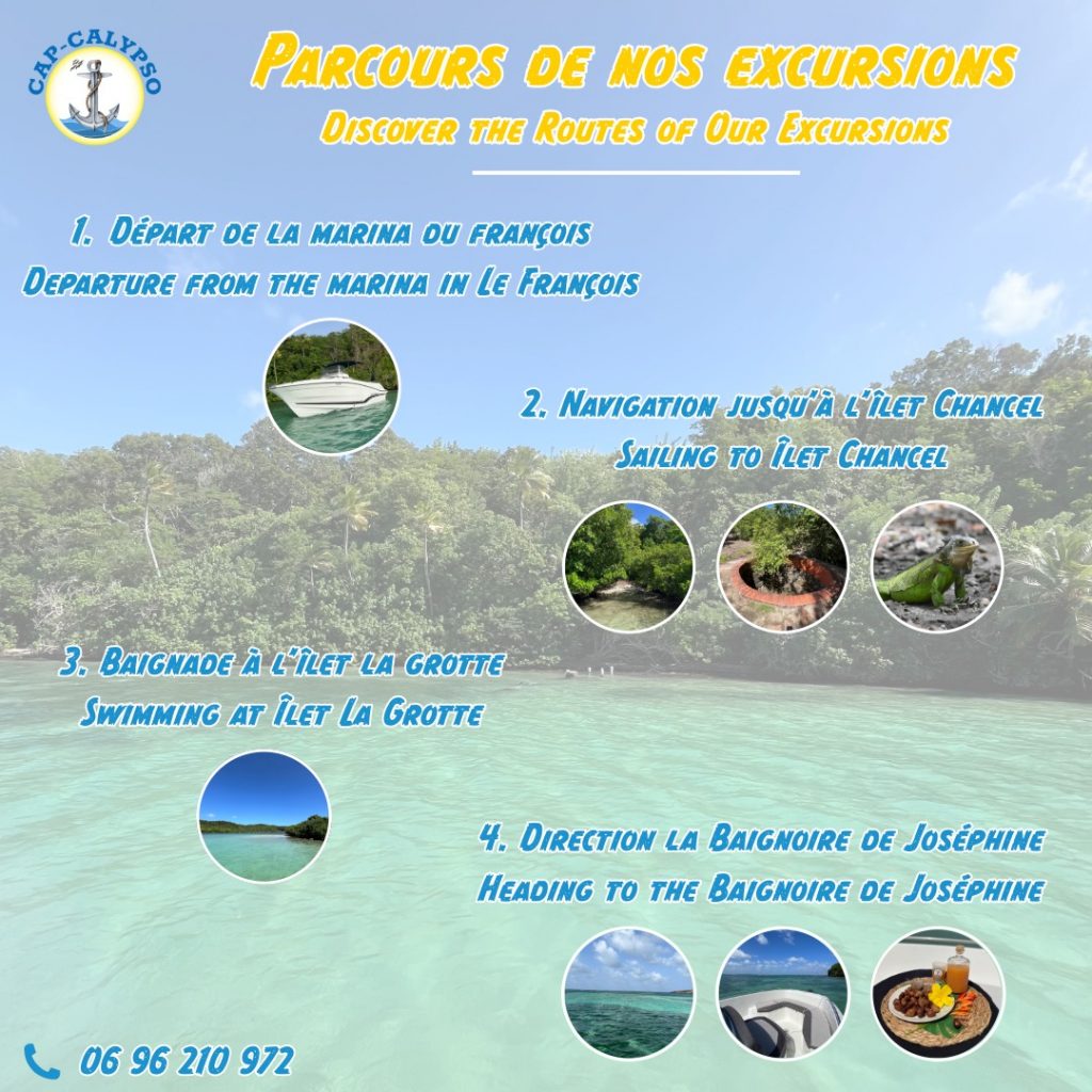 Avec Cap Calypso, embarque pour une journée en mer au départ de la Marina du François : balades privatisées jusqu’à 8 personnes, essence comprise, pour explorer les îlets du François et du Robert, les fonds blancs et les eaux turquoise.