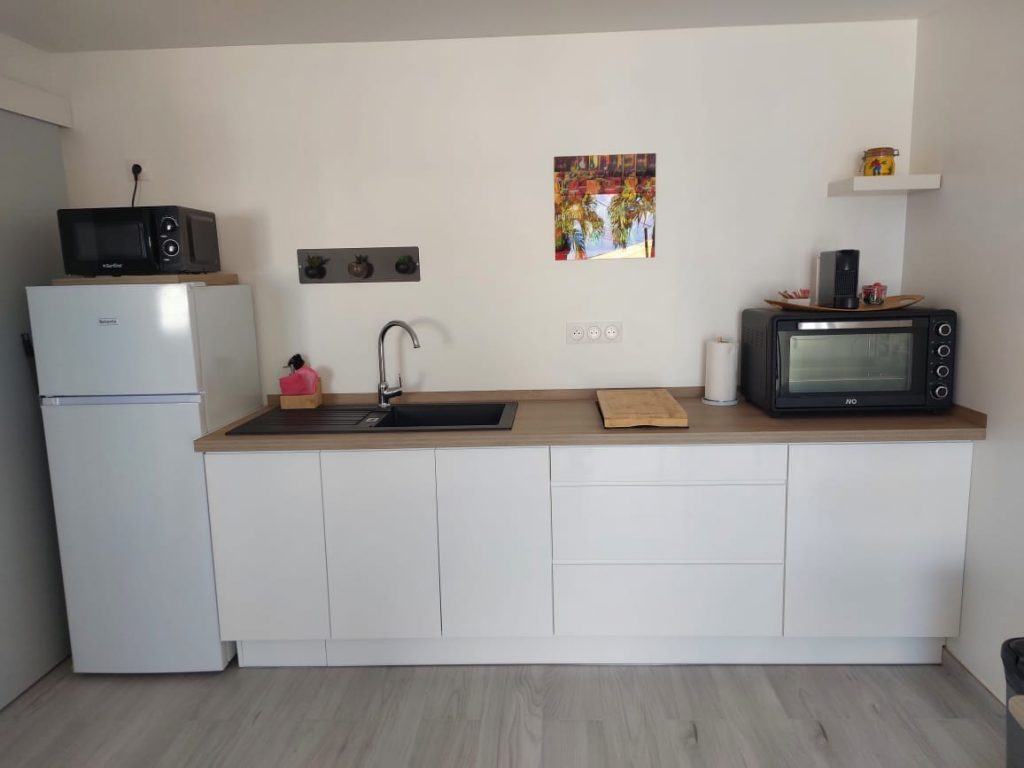 ❀ Cannelle (T1 – 2 personnes + 1 enfant) : pièce de vie + grande terrasse avec cuisine.